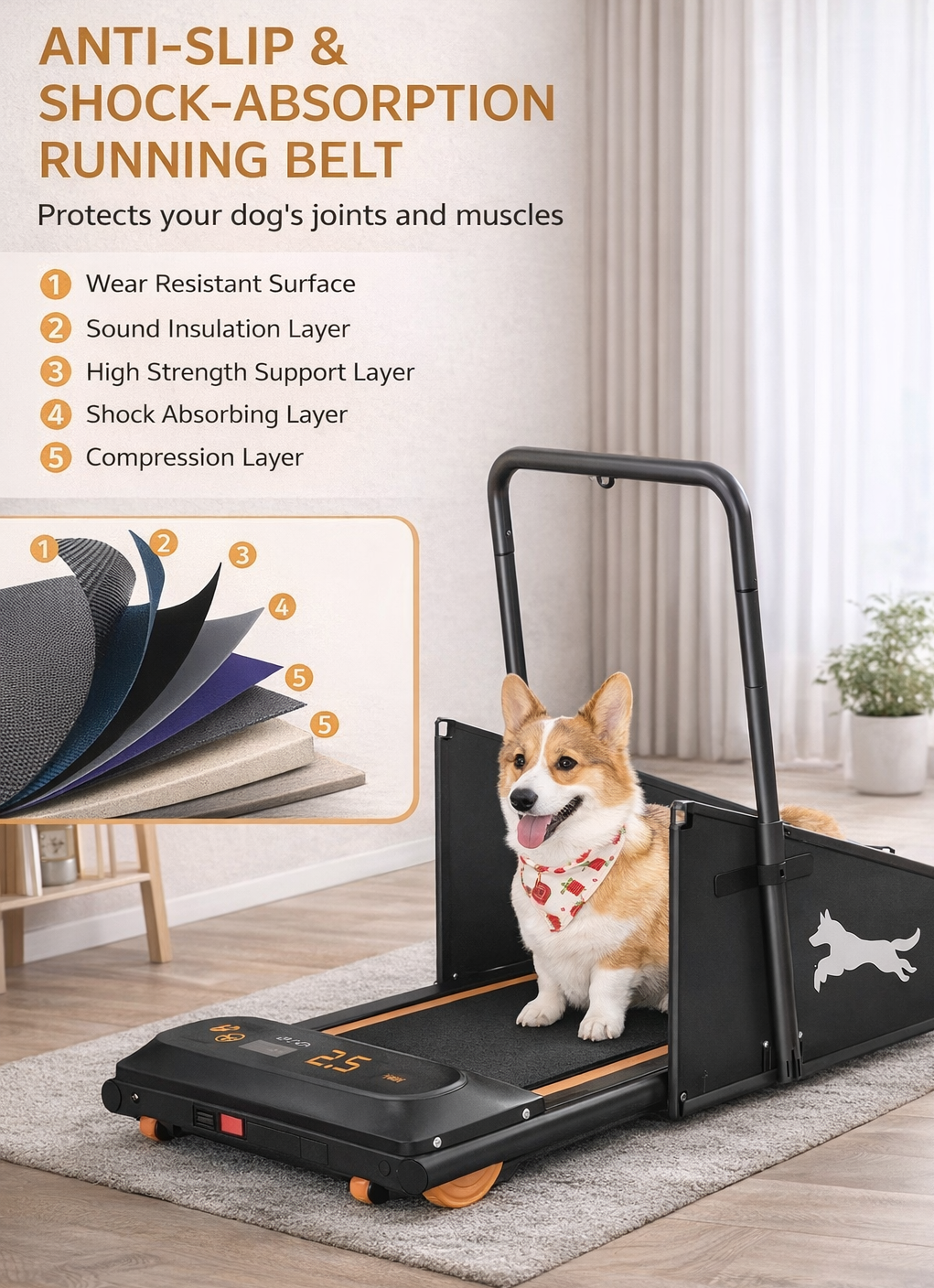 Featuring a quiet motor, this treadmill operates with low noise, making it suitable for apartments and shared living spaces. The adjustable speed range of 1–4 MPH allows you to customize your dog’s walking pace, while the anti-slip, shock-absorbing running belt helps support joint comfort and stability.
